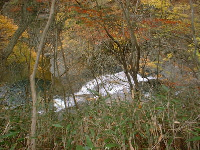 | 最後の朽ちた木造の橋の脇を慎重に進み 滝の下の河原へ降りる | |