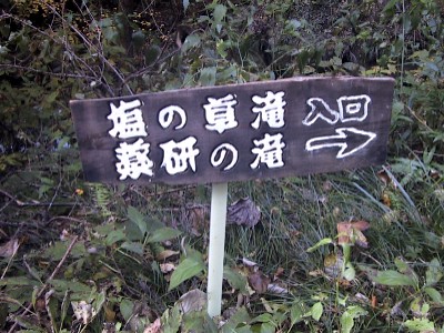 そのまま薬研の滝方面に歩いてゆくと行き止まりのところに(対岸)塩の草滝の看板