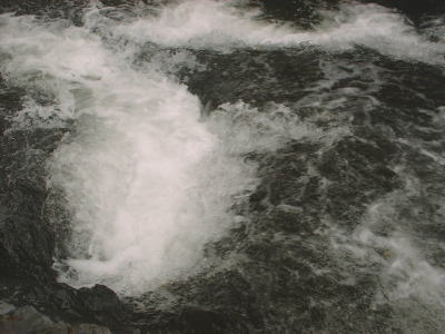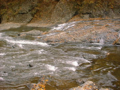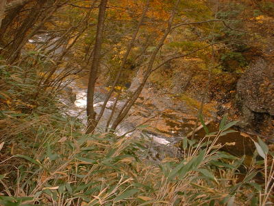 | 最後の朽ちた木造の橋の脇を慎重に進み 滝の下の河原へ降りる | |