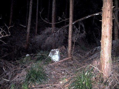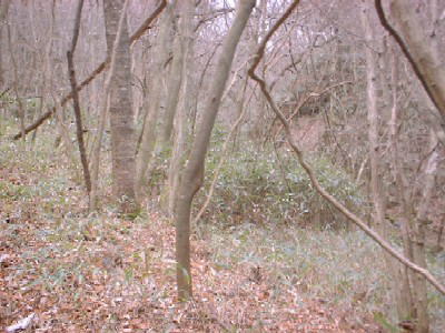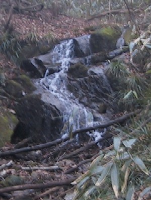| しばらく杉山を歩くと拓けた河原の出る 川なりに右へ | しばらく歩く・・・・そしてこの笹の奥に・・・ |